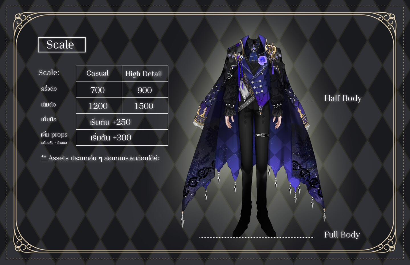 ครึ่งตัว 700 / เต็มตัว 1200 (รวมดีไซน์และเชิงพาณิชย์)ชุดแบบทั่วไป เสื้อยืด เสื้อเชิ้ต สเวตเตอร์ ชุดสูท ชุดนักเรียนที่มีรายละเอียดไม่มาก หรือมีเครื่องประดับเพียงเล็กน้อยHigh Details Style